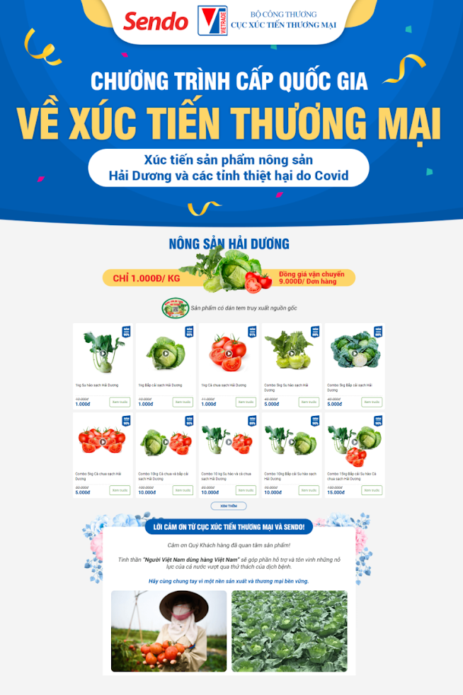 Từ ngày 09.03.2021 Chương trình xúc tiến thương mại Cấp quốc gia được Bộ Công thương tổ chức bán online trên sàn TMĐT Sendo. Chỉ với 1.000đ cho 1kg nông sản không giới hạn số lượng mua với đa dạng nhiều nguồn nông sản từ Hải Dương như: Bắp cải, su hào, cà chua, trái cây,... Đặc biệt, dù mua nhiều hay mua ít, bạn chỉ mất phí vận chuyển tối đa là 9.000đ.